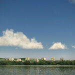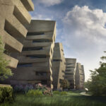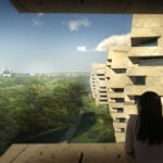 Community functions are housed in low buildings hidden among the trees, oriented towards the little branch of the Danube, while the hotel rooms are placed in the towers with stone-cladded elevation, alining on the Danube side. The building units are connected on the ground floor by a communication system articulated by internal atriums with glass walls providing close contact with nature for the guests. The environment with ancient trees flows into the atrium-like bays of the building units, and the high-scale complex, apart from saving the trees, organically fits in with the lush environment. The forest around the hotel, with the built walking paths and garden pavilions, also serves recreation and relaxation. The building and the untouched nature form an organic unit both functionally and visually, and looking from the Danube and the city, only the megalithic residential towers peer out from the foliage of the trees as characteristic landscape elements.