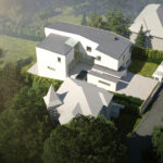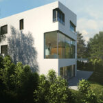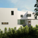 The closedness of the entrance elevation composed with solid surfaces and narrow openings is counterbalanced by the glazed openness of the garden sides creating dynamics attracting towards the garden in the spatial structure. The “wall-and-hole“ architecture fundamentally characterizing the house is not fully resolved even on the most open garden elevation. The loft and the swimming pool levels were shaped with reserved window surfaces, high lintels and solid bulwarks. The internal court is embraced from three sides by one or two levels and at some places floating masses, but full-level height openings are only along the court; the wall surfaces mostly preserve their compactness. Regarding the materials used – from the major periods of the development of Rózsadomb – we reflected the modern traditions before the war. The elevations are simple, plastered, white surfaces with metal-structure glass walls and wooden-structure doors and windows. Approaching from the street, the entrance is defined by the connection of the ground-floor garage and the two-level cantilevered living section bending over it. The transversal triple space of the kitchen-dining room-living room is explored from the space of the facile, open staircase adjoining from the side, which transparently frames the internal court with crosswise architectural and interior design elements, while it leads to the terrace floating over the garden. From this main level, one can reach the loft upstairs or the swimming pool and the service level downstairs, using the lift or the staircase next to each other.