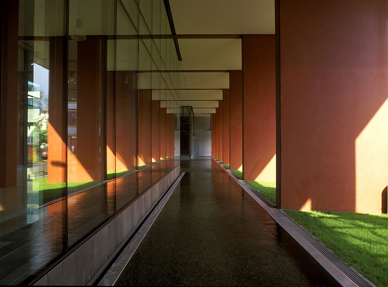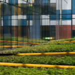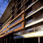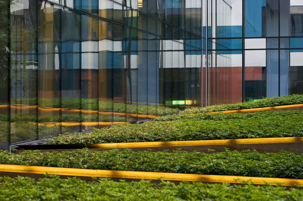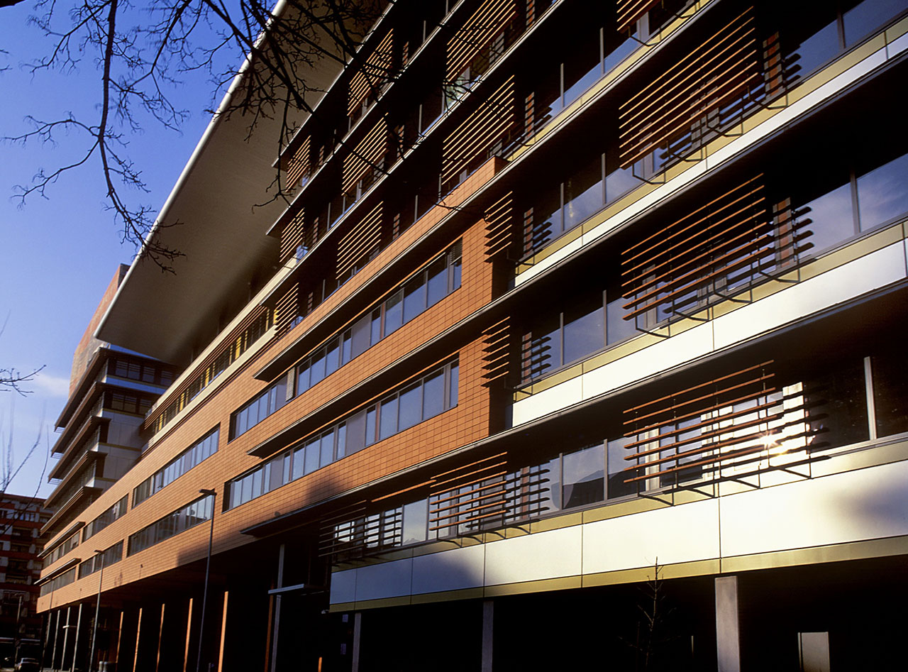 A sarkokon álló, a függőleges közlekedő magokat rejtő tornyok jelölik ki az együttes bejáratait, fontos vertikális hangsúlyt hozva létre a Váci út mentén futó, azonos magasságú térfalban. Az épület egy belső udvar köré szerveződik, melyet vízmedence választ el a közterülettől, miközben a vizuális kapcsolat az utcával két szint magasságban megmarad. Itt lettek elhelyezve többek között a pihenőterek, a kávézó és az étterem, így az intim udvar valóban az itt dolgozók életterévé vált.