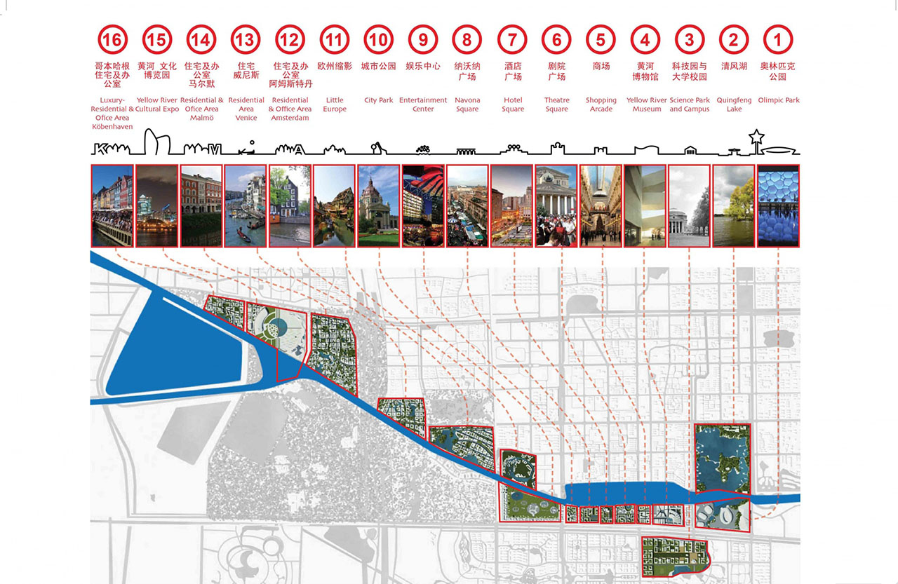 Fentiek alapján 16 eltérő karakterű fejlesztési terület lett meghatározva, melyek építészeti kialakítása alapvetően befolyásolhatja Dongying városképét a következő évtizedekben. A különböző negyedek beépítését a jellegzetes európai városi hagyományok és térformák – adott esetben konkrét európai előképek – illetve a kínai igények együttes szem előtt tartásával formálták meg. További részletes koncepciótervet alkottak a lakónegyed és a Sárga folyó múzeumának megformálására. Városi léptékű javaslatuk izgalmas kísérlet az európai hagyományok átültetésére az attól gyökeresen eltérő, dinamikusan fejlődő kínai közegbe, ahol a források rendelkezésre állnak a hatékony és modern szemléletű városfejlesztésre.