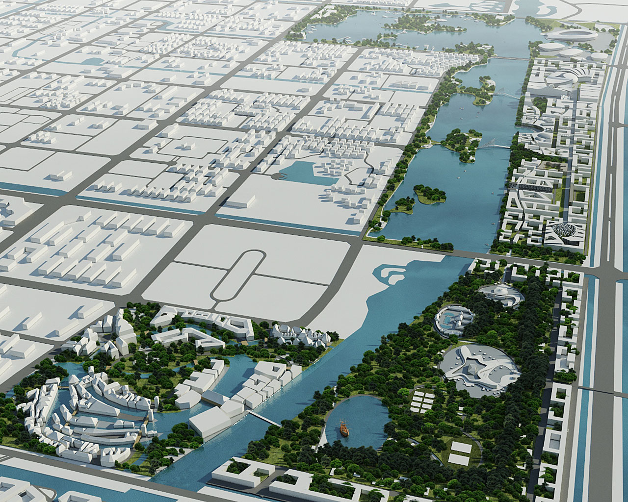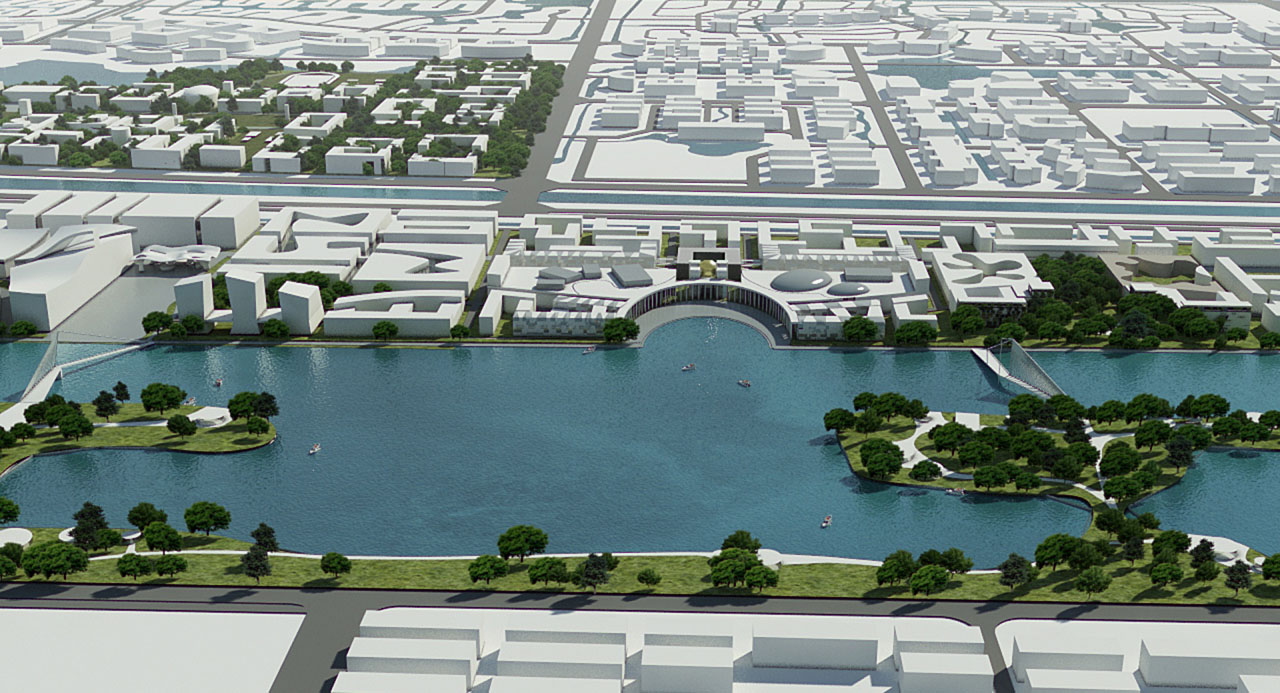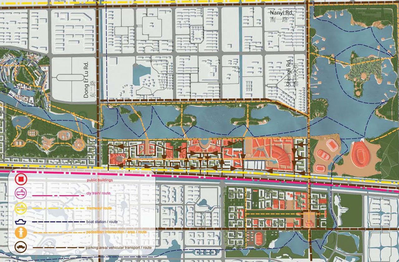 A Csingfeng tó és a Sárga folyó körzetében, Dongying város új, 10km hosszú folyóparti városközpontjának fejlesztési terve a hagyományos európai városépítészet tanulságaival felel a kínai városvezetés igényeire. A ZDA koncepciója a lakó-, kereskedelmi és középületek koncentrált fejlesztését a gyalogos zónák, a közösségi közlekedés és a közterek jelentőségüknek megfelelő építészeti megformálásával emeli arra a nívóra, ami meggyőződésük szerint a 21. században születő város sikeres működésének záloga.
