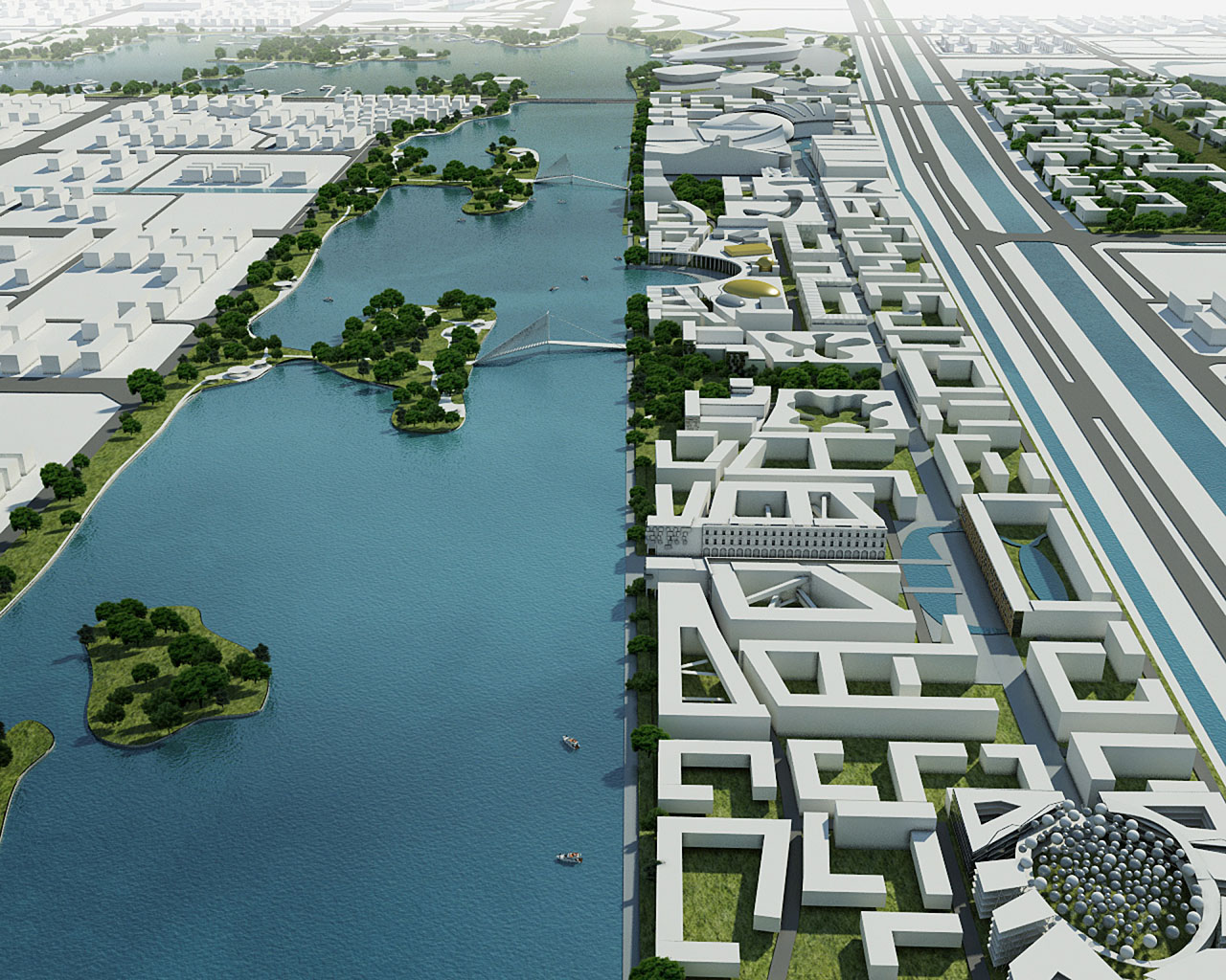 A koncepció a topográfiai adottságok alapján a folyó és a tópart által kijelölt derékszögű tengelykereszt mentén négy jól elhatárolható fejlesztési egységet határoz meg: