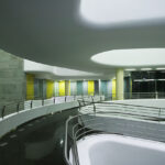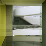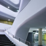A két épületszárny között elhelyezkedő tágas, plasztikusan kialakított, s az egyedülálló üvegkonstrukciónak köszönhetően különleges „külső-belső tér” élményt adó előcsarnok a ház igazi építészeti attrakciója. Ebben hol galériaként, hol nyitott lépcsőtérként Möbius-szalagszerűen íves fehér test csavarodik: az erőteljes, szoborszerűen ívelt hidak a térben is megteremtik az iroda- és kutató épületrész közötti elválaszthatatlan, ugyanakkor rugalmas kapcsolatot.