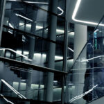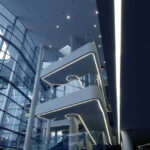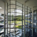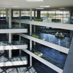 A 9 irodai szárny legyezőszerűen veszi körül az üvegezett előcsarnokot. A hatalmas alapterületet befogadó épület osztott alaprajzi kialakítása révén szerves kapcsolatban áll a környező természettel. Az épületszárnyak egy-egy szintjén 50-60 fős irodaegységek (unitok) működnek, nyitott tereik, a zöld környezettel kapcsolatot tartó hatalmas üvegfelületeik flexibilis és emberléptékű munkakörnyezetet biztosítanak. A unitokon belül kialakított zárt tárgyalók lehetőséget adnak az intim munkavégzésre. A többszintes, a környező zöldterület felé teljes magasságában, több irányban üvegfalakkal nyíló előcsarnok az iroda szellemiségének elengedhetetlen részét, az intenzív közösségi életet szolgálja. A unitok összeköttetését a nyitott központi előcsarnokon keresztül a közlekedők dinamikusan kanyargó fehér szalagjai biztosítják. Változatos belsőépítészeti kialakítású tereik további lehetőséget kínálnak a kommunikációra. Az épület az építészet társ-szakmáiat is bevonja a humanizált munkahelyi környezet kialakításába: közösségi tereiben és környezetében kiemelt szerephez jutott a kortárs képzőművészet, tájba ágyazottságának köszönhetően pedig a természet közeli munkahely fogalma valódi értelmet nyert.